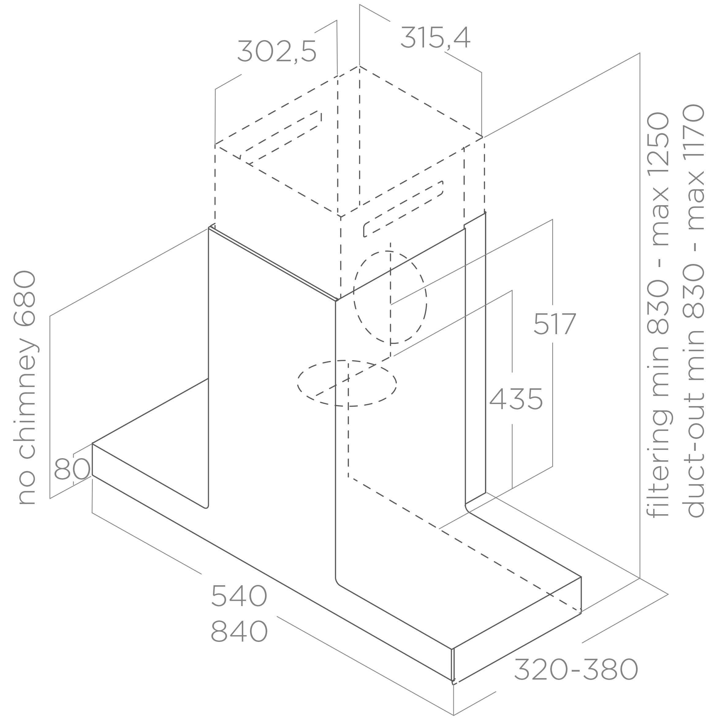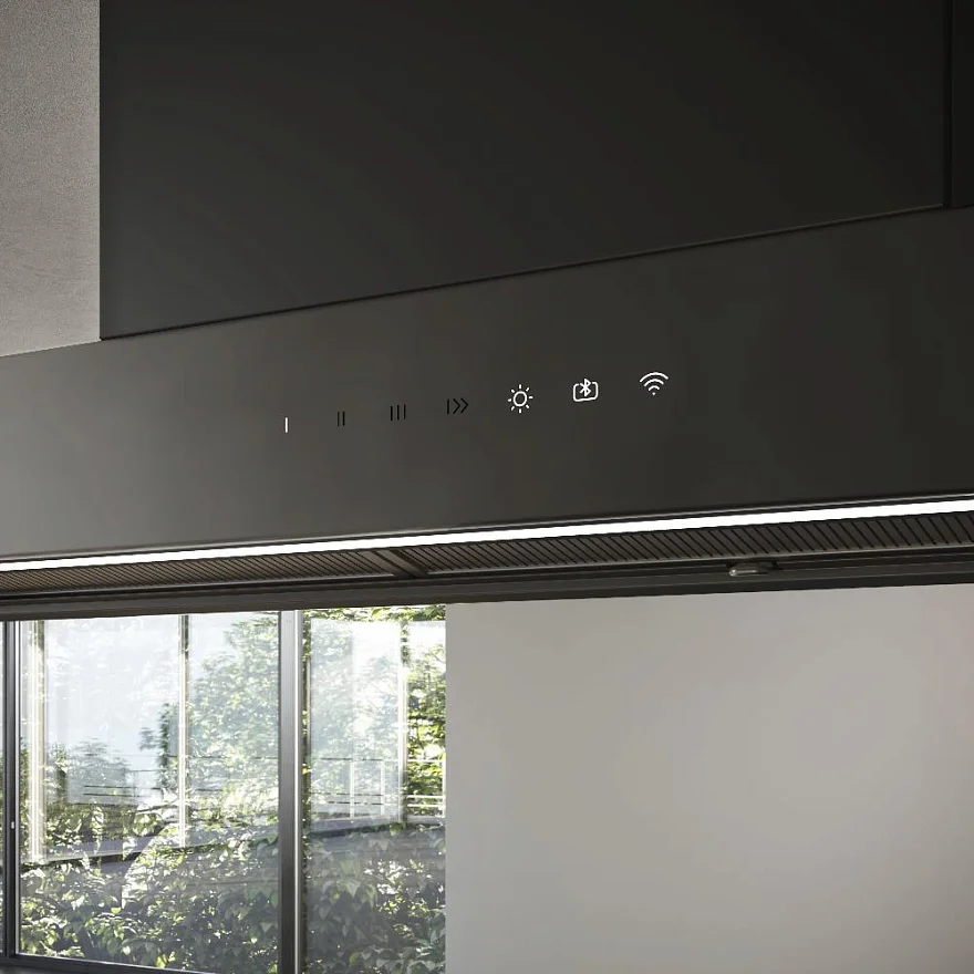 Размеры модели составляют 83-117-125 см в высоту, 84 см в ширину и 32-38 см в глубину. Модель работает в двух режимах: рециркуляции и отвода, что позволяет выбрать наиболее подходящий режим в зависимости от условий эксплуатации. Управление вытяжкой осуществляется с помощью сенсорных кнопок, что обеспечивает удобство и простоту использования. Вытяжка имеет три скорости работы и интенсивный режим, что позволяет эффективно очищать воздух даже при интенсивной готовке. Освещение в вытяжке осуществляется с помощью светодиодной ленты STRIP LED, которая обеспечивает равномерное и яркое освещение рабочей зоны. Модель также оснащена индикатором насыщения фильтра и таймером с автоотключением, что обеспечивает безопасность и удобство использования.